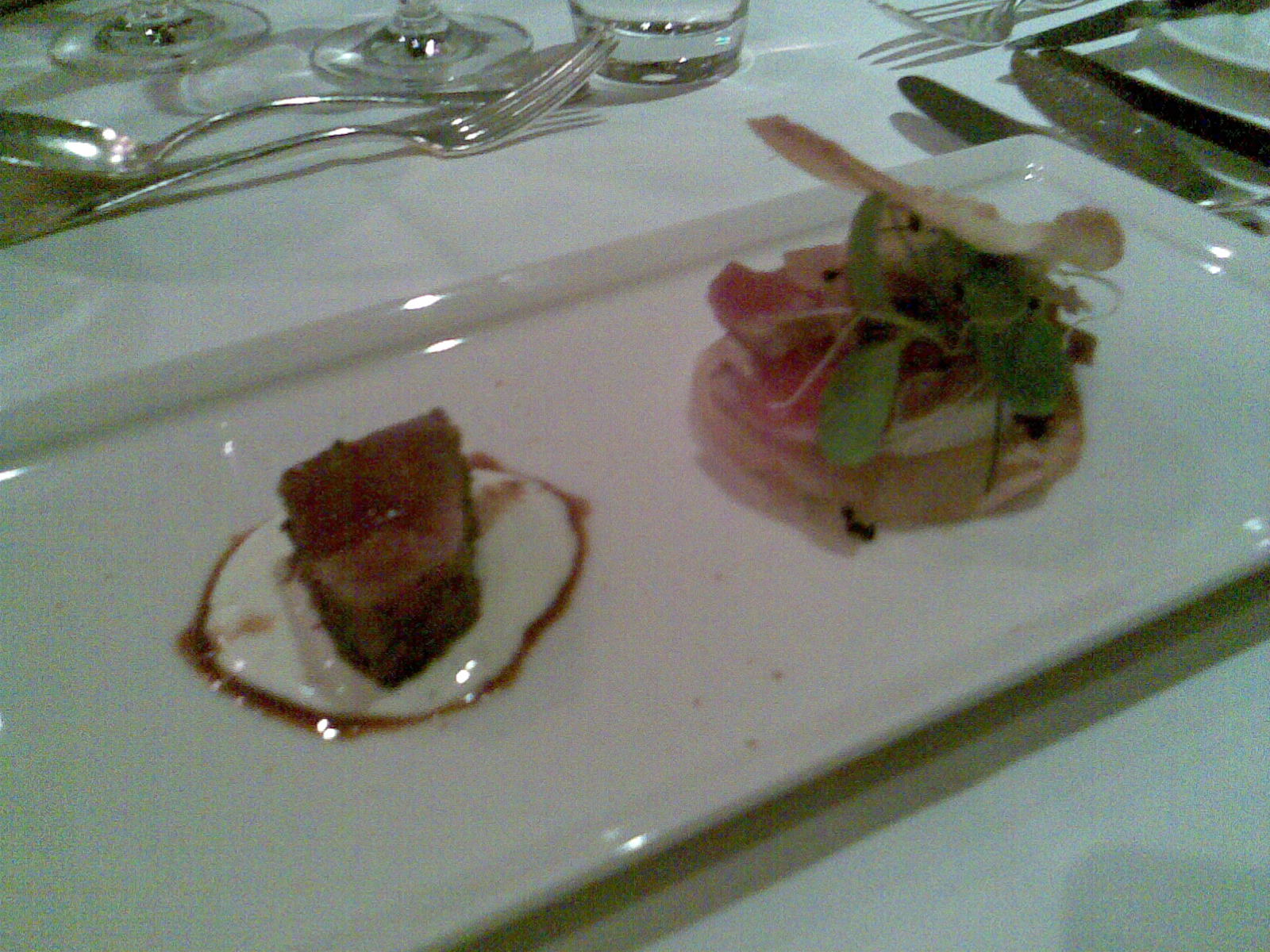 Wir starteten gleich mit dem Highlight des Abends. Das „Tuna-Erdnuss-Sandwich mit Wasabimousse und eingelegtem Ingwer“ überzeugte vollends. Der Tunfisch war perfekt gebraten, das Sandwich war knsuprig und die Wasabimousse hatte die perfekte Schärfe. Die Armomen passten perfekt – auch wenn man den Erdnussgeschmack vergebens suchte.