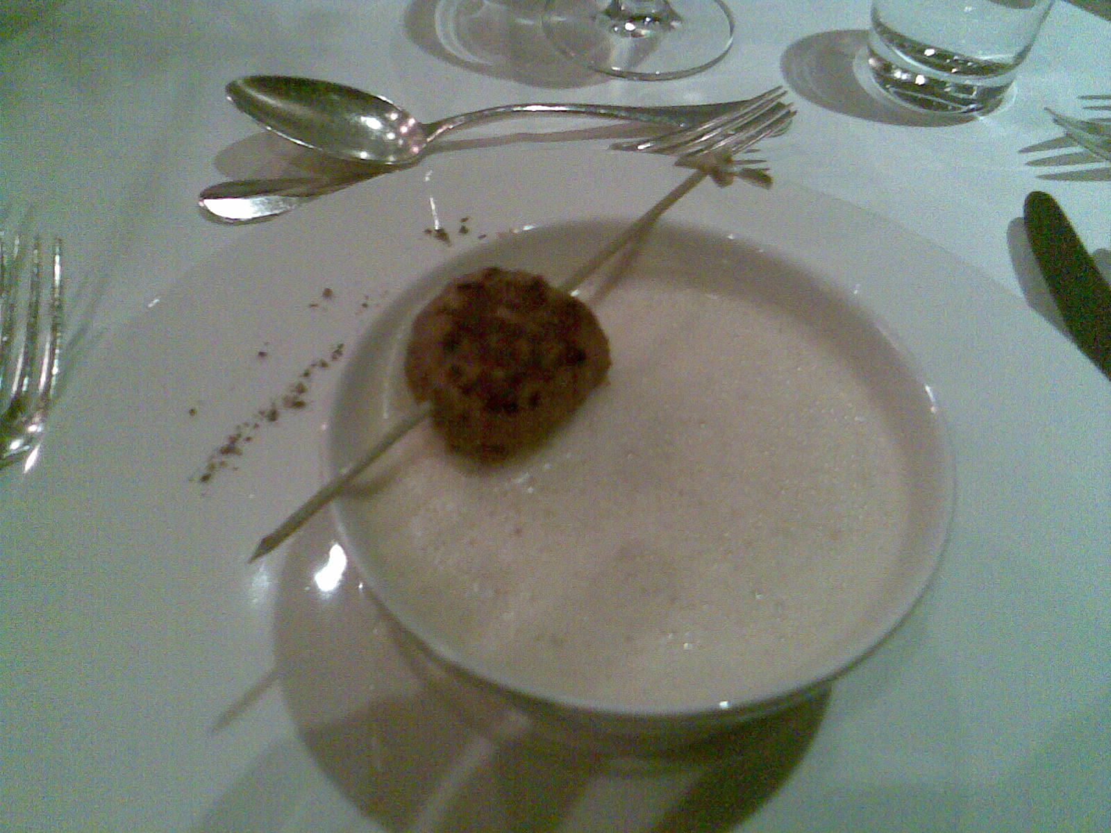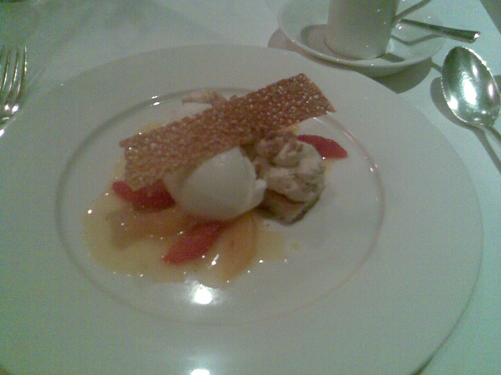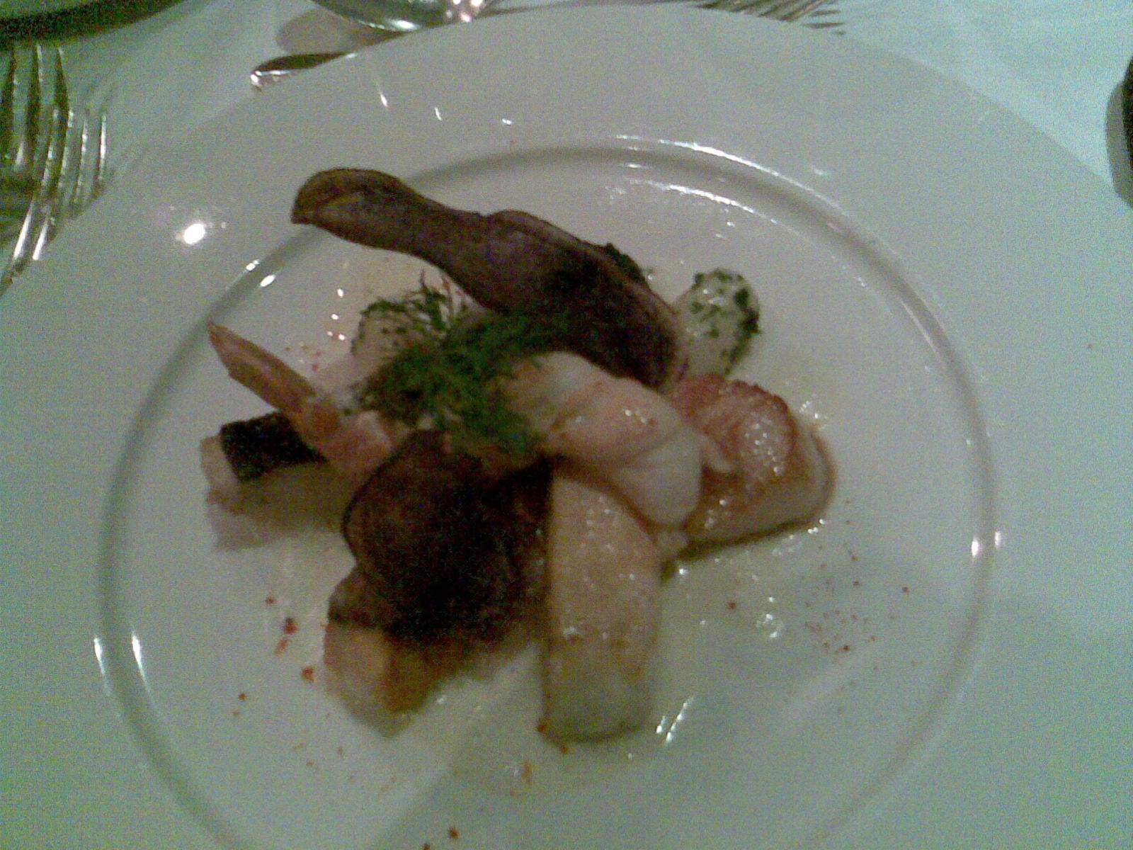 Vom Fischgang habe ich mir persönlich viel versprochen „Fisch- und Krustentierpalette an einer Champagnersauce gedünsteter Blattspinat und Petersilienkartoffeln“. Es war aber zu wenig aufregend. Die drei Fische (Hecht, Saibling und Heilbutt) waren zwar gut gebraten doch die Jakobsmuschel war zu gummig. Bei den Krustentieren hätte ich neben dem Scampi nach eine weitere Auswahl erwartet.