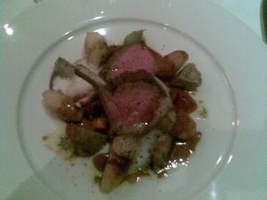 Das „Lammkarre in der Ducca-Kruste an einem Kräuterjus Artischockengemüse und Bratkartoffeln“ war ein feiner Hauptgang. Das Lamm schmeckte und war Butterzart. Auch super, ein Supplement an Sauce wurde gleich auf den Tisch gestellt und so konnte man die noch zu harten Kartoffeln tunen.