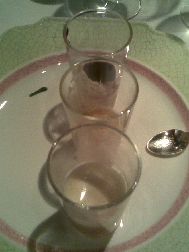 Wir waren gespannt auf’s Essen und fragten uns ob Petermann unsere Erwartungen erfüllen kann. Der Gruss aus der Küche war schon mal ein richtiger Volltreffer. Vorallem eins der drei Gläschen beherbergte was geniales: Entenlebermousse mit einer Schicht von Kirschen – wow, genial! Das Ganze war so fein, dass ich sogar vergass das Foto zu machen…