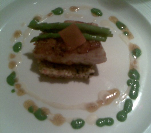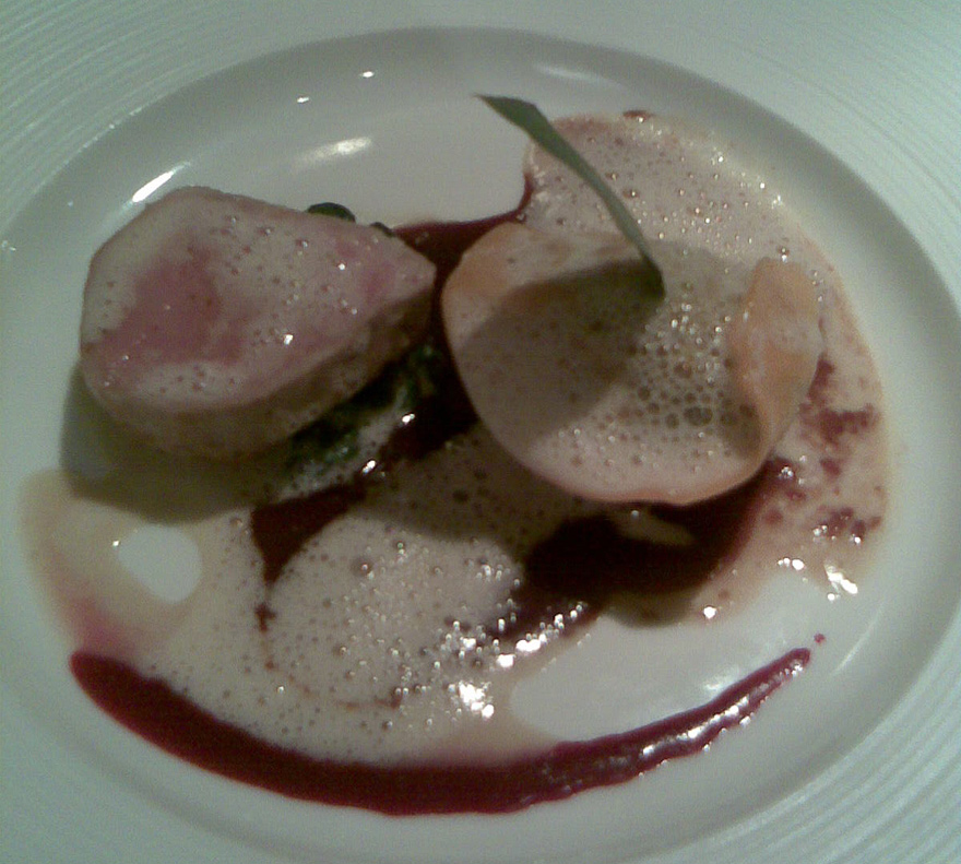 Und dann, völlig überraschend das Highlight des Abends: „Gebratene Gänseleber auf Kefen-Bohnen-Salat mit Eschalotten-Confit“. Ich bin kein grosser Fan von Gänseleber, doch wenn das so schmeckt wie hier, dann werde ich zum Fan. Die perfekt gebratene Leber hatte schon in der Nase ein tolles Aroma, auf der Zunge verging sie richtig. Dazu den passenen Wein – wow! Einziger Wehrmutstropfen: der Gast neben mir, erhielt den selben Gang 30 Minuten später und auf seinem Teller lag noch eine wunderschöne Gänsenleber-Praliné. Ich hätte extrem gerne da rein gebissen und fragte mich ob man die bei mir vergässen hätte. Aber generell ist mir aufgefallen, dass die Teller jeweils ein wenig anders aussehen – ob dekorativ oder mit anderen Mengen…