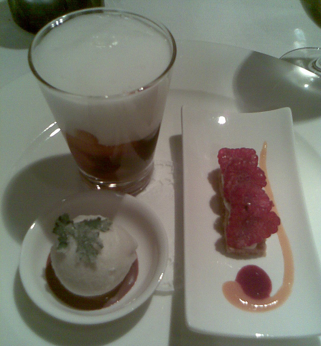 „In Sauternes pochierter Pfirsich Blätterteil Mille-feuilles mit Himbeeren und Zintronengras-Eis“ schloss das Menü ab. Das Dessert konnte das Nivau der vorgängigen Speisen nicht halten, keine der Komponenten kam über ein „in Ordnung“ hinaus. Schade, hätte man hier noch einen genialen Schlusspunkt setzen können.