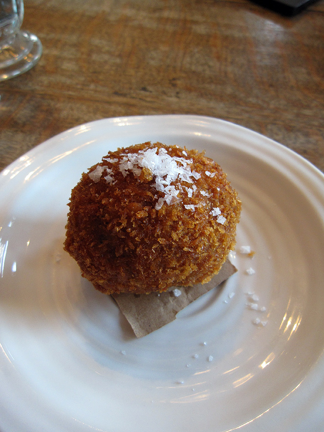Das frittierte Ei ist ein Britischer Klassiker, ein Evergreen auf der „Bar Snacks“ Karte im ‚The Harwood Arms‘ und wird hier zu fairen 3 £ serviert. In der Mitte wartet ein noch leicht flüssiges Ei auf seinen Verzehr. Dies ist umwickelt mit Schweine- und Wildfleisch, knusprig frittiertem Paniermehl und ein paar Flocken Salz auf dem Haupt. Das Vanison Scotch Egg ist ein Starter den man so schnell nicht vergisst. Zuerst beisst man sich durch eine dünne, knusprige Hülle bevor man zum fein gehackten Fleisch trifft und zum Schluss das flüssigen Ei schmeckt. Wunderbar! Wer im ‚The Harwood Arms‘ isst und vergisst diesen Snack zu bestellen hat definitiv etwas verpasst.