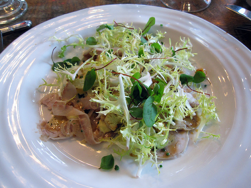 Warm Salad Of Thinly Sliced Smoked Pork Belly With Soft-Noiled Pheasant Eggs, Green Beans, Crispy Pigs‘ Ears And Picallili [7/10]