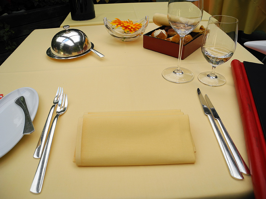 Bei dem grossen Weinkeller von über 50’000 Flaschen empfiehlt es sich mit den öffentlichen Verkehrsmitteln anzureisen. Da wir das ‚Tantis‘ an einem heiss-schwülen Donnerstagmittag besuchten, freuten wir uns auf einen schön klimatisierten Raum. Zumal man sich gemäss Reservationsbestätigung „angemessen kleiden“ sollte. Die Krawatte liessen wir zwar im Auto aber das lange Hemd wurde trotz Hitze angezogen. Umso ernüchternder dann die Information beim Eintreffen, dass man das Essen heute im Garten servieren wird.
