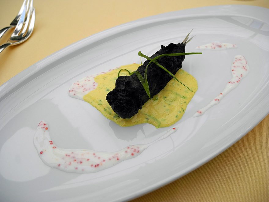 Unser Menü startete mit einem kleinen Gruss aus der Küche. Eine frittierte Sardine in einer mit Sepia-Tinte gefärbten Kruste. Der Fisch war sehr fein und hatte trotz frittiertem Mantel ein schönes Eigenaroma. Die toll abgeschmeckte Currysauce passte super zum Fisch. Die weisse Crème-Frâiche hätte es nicht gebraucht.