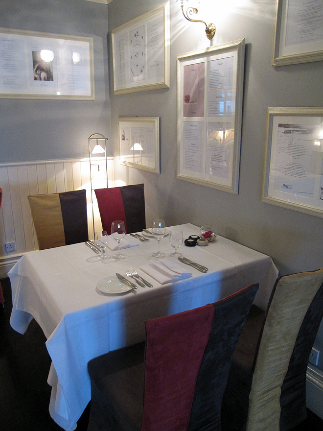 Menü: Die à la carte Auswahl ist sehr klein – vier Vor- und Hauptspeisen und drei Desserts. Diese haben fixe Preise: Zwei Gänge kosten 43.45 £, drei Gänge 54.45 £. Das Tasting Menü beinhaltet fünf Speisen dieser à la carte Auswahl und wird zusammen mit Kaffee und Petit Fours für 66 £, mit dem zusätzlichen Käseteller 75 £ (Preise jeweils inkl. 10% Service) serviert. Dauer des Menüs: kurze 2:20 Stunden.