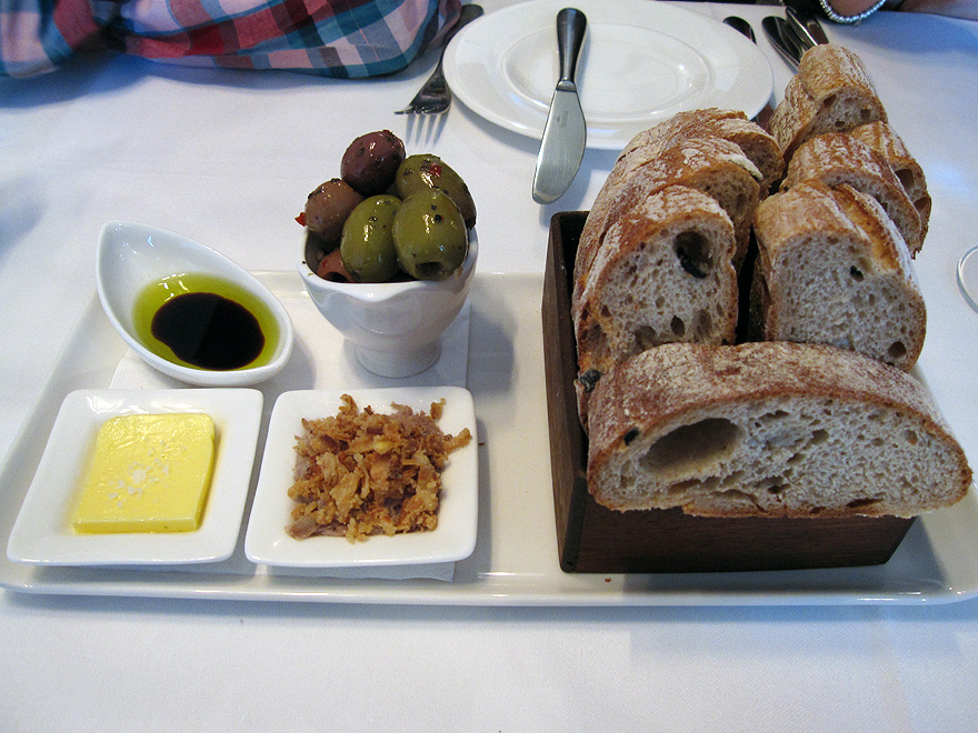 Ein Amouse Bouche wurde leider nicht serviert. Immerhin gab es zum Start feine Oliven und Brot welches man entweder  mit der gesalzene Butter oder den geröstete Zwiebeln auf Schweineschmalz bestreichen konnte. Ein einfacher aber schöner Auftakt.