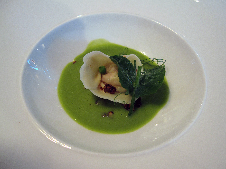Welch wunderbare Erbsensuppe, einfach himmlisch! Dazu lagen karamellisierte Erbsen und gesalzene Pekannüsse im Teller welche tolle Akzente setzten. Auch der hauchdünne Tortellini mit der würzigen Fleischfüllung schmeckte vorzüglich. Rundum harmonisch – eine Wucht!