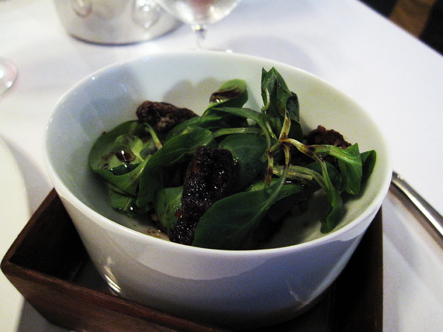 Der Heilbutt war mit leichten Gewürzen und Blumen geschmückt. Diese unterstützten den perfekt gegarten Fisch ganz subtil. Auch die Süsse der goldenen Rosinen passte gut zum Heilbutt. Das Pastinaken-Mousse und der frittierte Lardo waren ebenfalls fein. Ein sehr überzeugender Gang wenn auch nicht mehr ganz so toll wie die beiden vorherigen Gerichte.