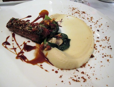 Eine Entenbrust die trotz des extrem intensiven Gewürzdeckels einen schönen Eigengeschmack hatte. Dazu gab es eine leicht scharfe Honigsauce. Der Sellerie-Püree war geschmacksintensiv und überzeugte genauso wie die Pilze und der Pack Choi. Die Lebkuchenkrümel hatten jedoch lediglich einen dekorativen Nutzen. Anders der Nüssli-Salat der zusätzlich gereicht wurde – der war absolut genial! Super frisch, eine tolle Soja-Sauce, frittierte Entenzungen (!) und für die Süsse Note: pochierte Birnenstückchen und Walnüsse.