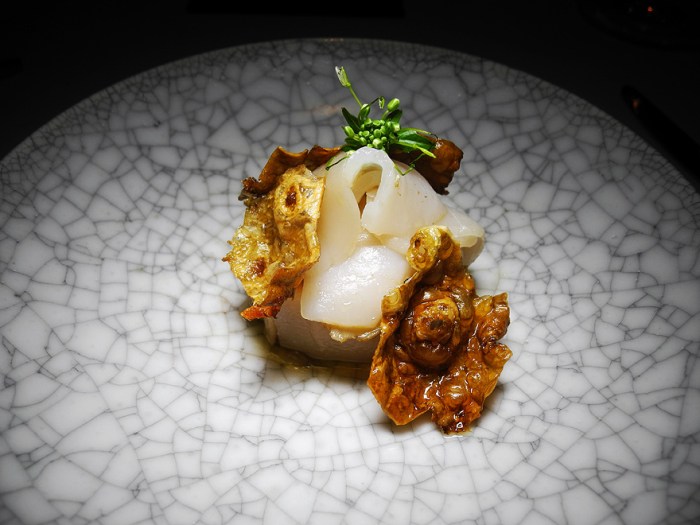 Smoked and confit pig cheek, shiitake, shaved scallop, Jerusalem artichoke leaves, juniper, bay [6/10]