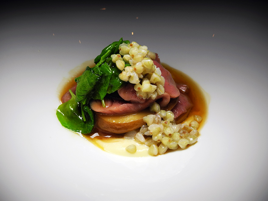 Pasture raised milk fed veal, poached in smoked bone marrow fat, shiitake mushrooms, raw buckwheat, young orach, parsnip [6/10]