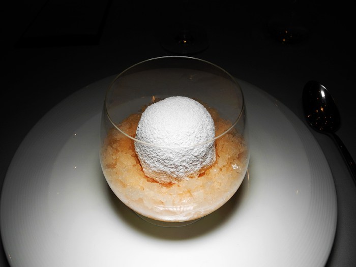 Das Snow Egg ist ein Signature Dish von Peter Gilmore. Seit 5 Jahren steht es ununterbrochen auf seiner Karte. Die Präsentation ist sehr anmutend. Wir werden aufgefordert, die Eierschale mit dem Löffel aufzubrechen. Nachdem das Ei zuerst einen überraschend starken Wiederstand gibt, ist ein wunderbares Knacken zu hören und wir erhalten einen Blick auf das Innenleben. Dieses erinnert uns an Amador’s Dessert mit Rieslingsschaum. Die knusprige Caramel-Schale ist süchtig machend, der Inhalt fruchtig leicht. Und so ist das Snow Egg das beste Dessert auf unserer Australienreise. Schade nur, dass das Eis mit Pfirsicharoma, welches das Ei umgibt, zu eisig und zudem masslos überdimensioniert ist.