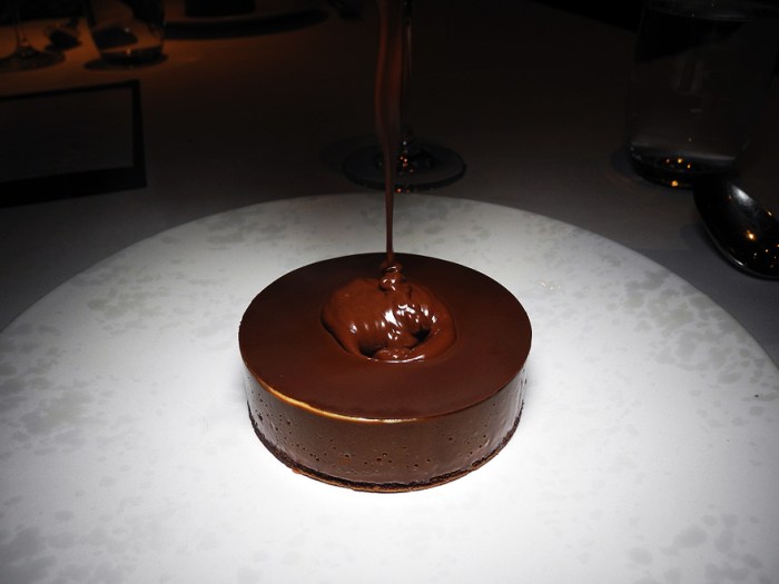 Während das Menu bis hierhin sehr leicht war (mit Tendenz zu etwas gar kleinen Portionen), wird das Ganze mit diesem Schokoladenkuchen in’s Gegenteil gedreht. Der Schoko Cake wird in sieben Texturen serviert. Etwas crumble, Canache und noch dünne Schokoladenschichten. Die achte Textur wird vom Servicemitarbeiter direkt am Tisch, in Form von heisser Schokolade, über den Kuchen gegossen. Dabei bildet sich in der Mitte eine kleine Einbuchtung und fällt dort leicht zusammen – schön inszeniert.