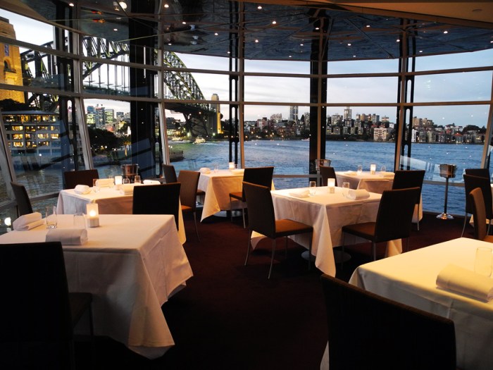 Ob Zufall oder gewollt, führt man uns aber tatsächlich an einen der besten Tische im ganzen Restaurant. Dieser steht in einer kleinen Rundung mit wunderschöner Aussicht auf Sydney’s Skyline. Um uns herum stehen zwar etwas gar viele Tische (wie auch im übrigen Restaurant, welches Platz für bis zu 150 Gäste bietet!), doch Dank der uns komplett umgebenen Fensterfront, haben wir Blick auf die eindrückliche Harbour Bridge und auch auf das imposante Opernhaus. Diese malerische Aussicht kann nur durch eines der grossen Kreuzfahrtschiffe, welche oft hier ankern getrübt werden, doch man erklärt uns zu Beginn, dass diese in der jetzigen Jahreszeit nicht anlegen.