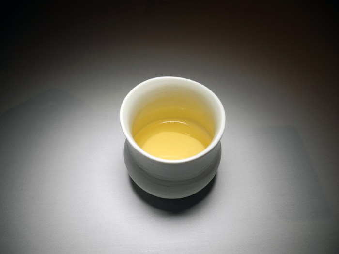 In einem kleinen Porzelanschälchen wird uns eine intensive, sehr harmonische Austernconsomé mit etwas Tofu serviert. Der Geschmack ist noch Minuten später in unserem Gaumen allgegenwärtig. Ein schöner Start.