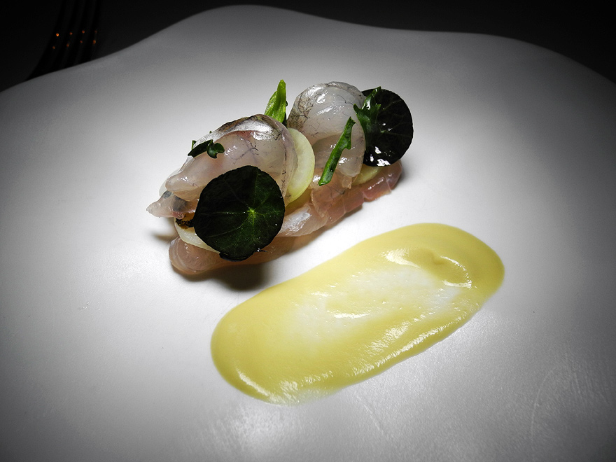 Sashimi of Corner Inlet rock flathead, Tasmanian trumpeter, salt cured wild eyster cream, black lipped abalone, raw sea cabbage, nasturtiums, warrigals, periwinkles [-/10]