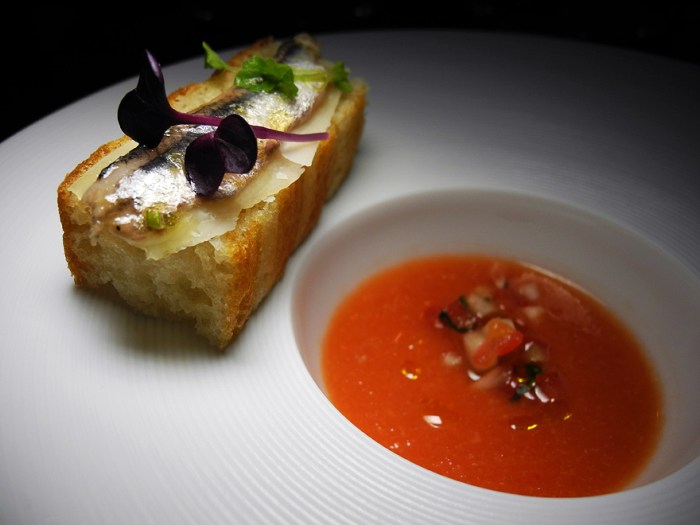Als Amuse Bouche stellt man uns diese schön angerichtete Komposition auf den Tisch. Die Tomatensuppe ist mit kühlenden Gurken verfeinert und schmeckt harmonisch und erfrischend. Das Focaccia ist luftig frisch, der Fisch und der Käse eine wunderbare Begleitung, welche bestimmt noch besser funktionieren würde, wenn man das Brot nur halb so dick aufgeschnitten hätte und sich somit der Käse stärker hätte durchsetzen können.