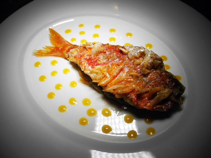 Auch geschmacklich wähnen wir uns im Paradies. Der Fisch ist von atemberaubender Qualität und mit hoher Kochkunst zubereitet. Die Rotbarbe ist saftig und der Salbei gibt dem Fisch eine zusätzliche Facette – wow. Auch genial ist die krosse Haut samt den Schuppen.