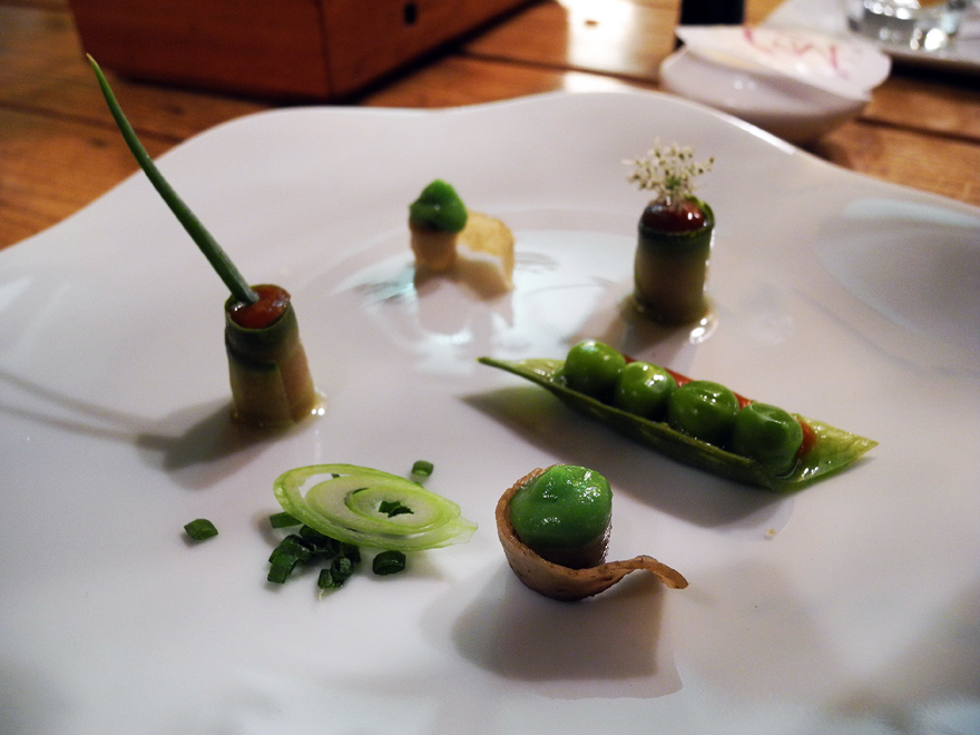 Auf dem zweiten Teller gibt es Gemüse – diverses von der Erbse und Peperoni. Alles ist sehr präzis und wunderschön angerichtet. Die Erbsen gefallen uns gut, richtig stark ist die Peperoni, welche sehr wuchtig schmeckt.