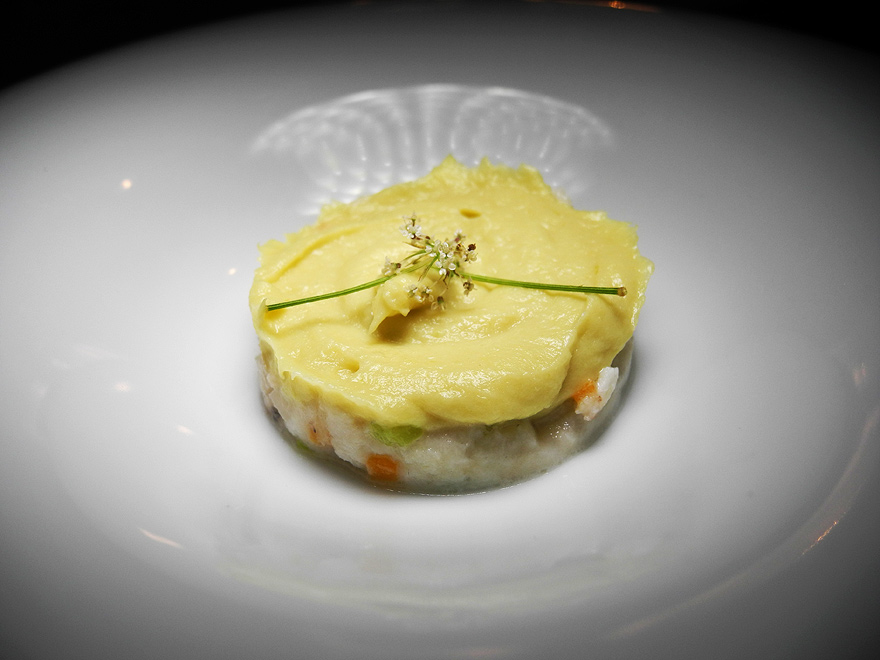 Bretonische Rotbarbe mit Salbei samt frittierten Schuppen auf Aprikosenbutter // Dazu Presskopf vom Steinbutt – Vichysoisse mit Ingwer // Südfranzösischer Gemüsesalat (31 €) [9/10]