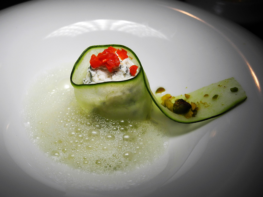 Der dritte Part dieser Teller-Trilogie bildet ein würziger Ricotta mit Gurkenschaum und Pistazie – ebenfalls überzeugend.