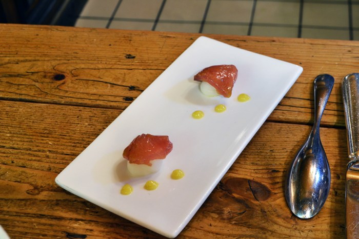 Auf dem zweiten Teller stehen Sushi der etwas anderen Art. Die dünne Scheibe vom Bonito schmeckt sehr gut. Darunter gibt es Reis als Crème verarbeitet. Eine spannende Kreation die uns sehr gut gefällt.