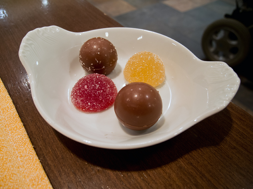 Zwei Schokoladenperlen mit Passionsfruchtfüllung und Gelées mit Himbeer und Quittengeschmack, schliessen das tolle Menü ab.