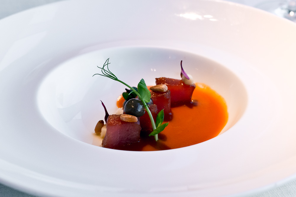 Für Küchenchef Jorge de Andrés ist es eine grosse Herausforderung, die Gäste bei dem eindrücklichen Panorama auf seine Kreationen fokussieren zu lassen. Dank seiner kreativen Küche, gelingt ihm das aber ohne Probleme. Für faire 70 € serviert man uns sieben sehr gute Gerichte.