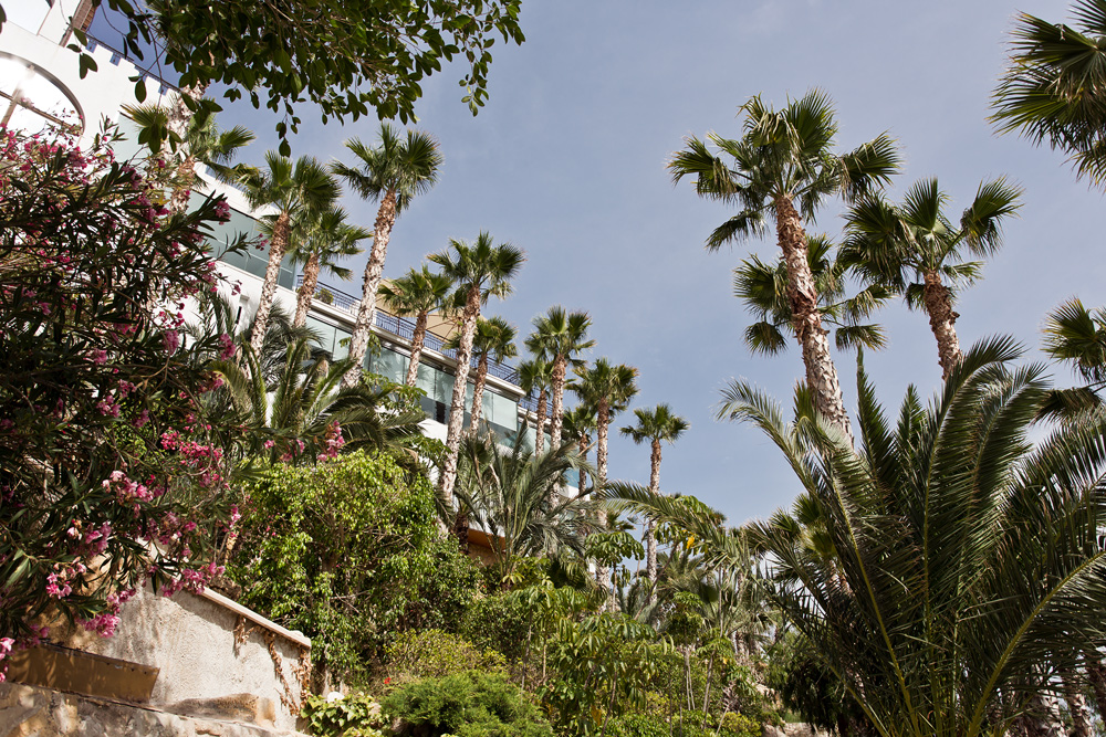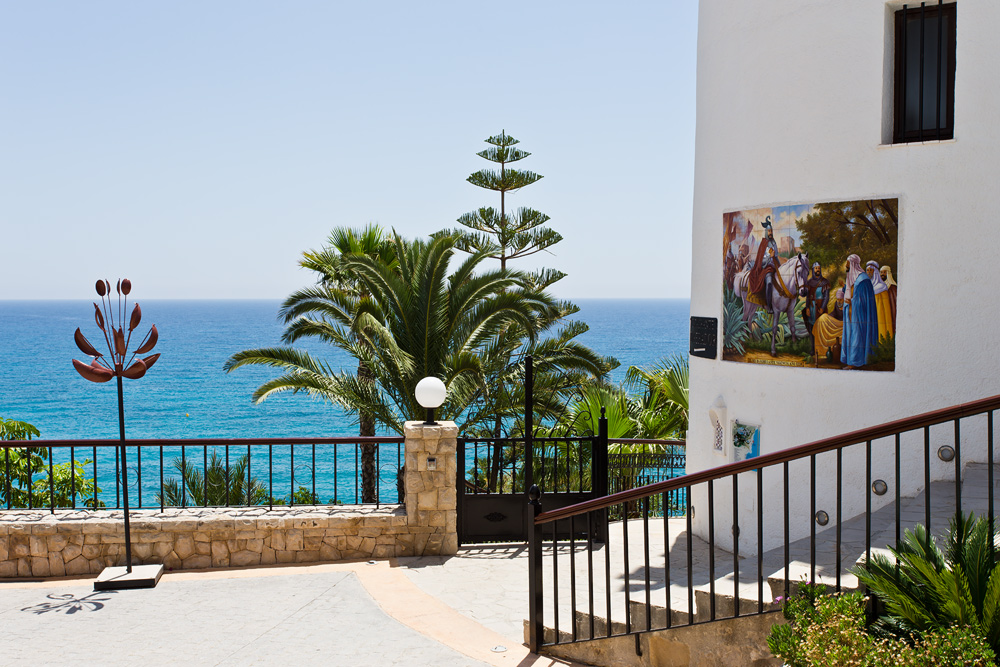 Mit dem gekühlten Auto (Tiefgarage sei Dank) geht es nochmals ein Stück weiter Richtung Süden. Villajoyosa, 30 Minuten östlich von Alicante, ist das nächste Ziel. Im Hotel Montíboli haben wir das Zimmer reserviert. Die schöne Anlage thront stolz auf einem Felsen. Die Lage ist einmalig. Unser Bungalow ist direkt an der Klippe und offenbart eine traumhafte Aussicht auf das Meer. Um selber im kühlen Nass zu schwimmen, kann man bequem den Lift zum Kieselstrand nehmen. Die Liegestühle können gegen ein kleines Entgeld gemietet werden.