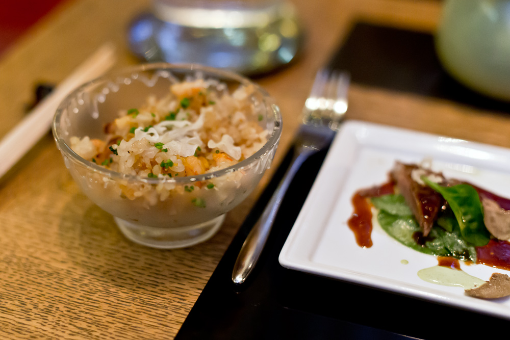 Die nächsten drei Gänge auf der Menükarte werden zusammen serviert. Auf dem Hauptteller liegen Wagyu-Steaks, welche mit einem Hauch frischem Trüffel gefüllt sind. Dazu erhalten wir einen intensiven Jus und eine ausgeklügelte Wasabi Sauce. Das Fleisch ist toll – nur schade, dass eines der drei Stücke zäh ist [6/10]. Der gebratene Reis in der Schale geriet indessen viel zu trocken [-/10]. Viel besser ist die ausgezeichnete Miso mit Pilzen und Algen [7/10].