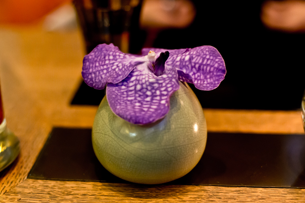 Die Musik ist laut. Anstelle von sanften japanischen Klängen, berieselt man die Gäste mit einer austauschbaren elektronischen Musik, wie man sie von unzähligen Lounges her kennt. Trotz des auffällig zuvorkommenden Service, wissen wir schon jetzt, dass das Yoshi nicht zu der Art Restaurants gehört, in denen man nach dem Essen gerne noch etwas länger sitzen bleibt. Wir sind aber nicht zum entspannen hierher gekommen, sondern weil die Küche ausgezeichnet sein muss. Dafür bürgt nicht nur der Michelin-Stern, sondern auch der Schweizer Spitzenwinzer Daniel Gantenbein, der uns das Lokal mit Nachdruck empfohlen hat.