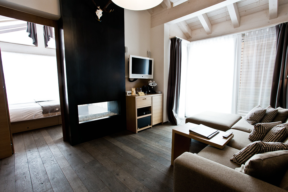 Zur Begrüssung kredenzt man uns einen schönen Walliser Fendant den wir in der kleinen Lounge geniessen. Die Jagd, die zweite grosse Leidenschaft des Gastgebers, ist hier und im restlichen Hotel allgegenwärtig. Nach dem Welcome-Drink führt man uns in unsere Suite. Dazu geht es zuerst nach draussen. Denn die 28 Zimmer und Suiten sind auf sechs verschiedene Chalets verteilt. Diese wurden in zwei Etappen gebaut und stehen rund um das Haupthaus. Die Gäste kommen dadurch in den Genuss eines einmaligen Alpenfeelings mit einem hohen Mass an Privatsphäre. Die einzelnen Chalets können zudem auch komplett gebucht werden.