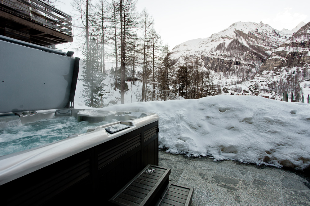 Nach ein paar Metern erreichen wir das Chalet Nummer IV in dem unsere Junior Suite auf uns wartet. Das Gepäck ist selbstverständlich bereits verstaut. Die Suite ist hell, mit 49 m² sehr grosszügig und äusserst komfortabel eingerichtet. Vom grossen Balkon hat man einen wunderschönen Blick auf Zermatt und das weltbekannte Matterhorn. Mit der Amici-Kaffeemaschine brauen wir uns einen feinen Espresso, setzen uns auf die Couch und aktivieren per Knopfdruck das Kaminfeuer. Genau so haben wir uns einen Aufenthalt in einem Luxus-Chalet vorgestellt. Aber es kommt noch besser. Denn jedes der fünf Chalets hat im Untergeschoss einen kleinen Wellness-Bereich mit Sauna, Dampfbad und einer Ruhezone. Das Highlight steht draussen: Ein Whirlpool mit Blick auf die malerische Berglandschaft. Die Lage des CERVO ist perfekt, die Abgeschiedenheit bietet viel Ruhe und dank der erhöhten Lage geniesst man eine unvergessliche Aussicht.
