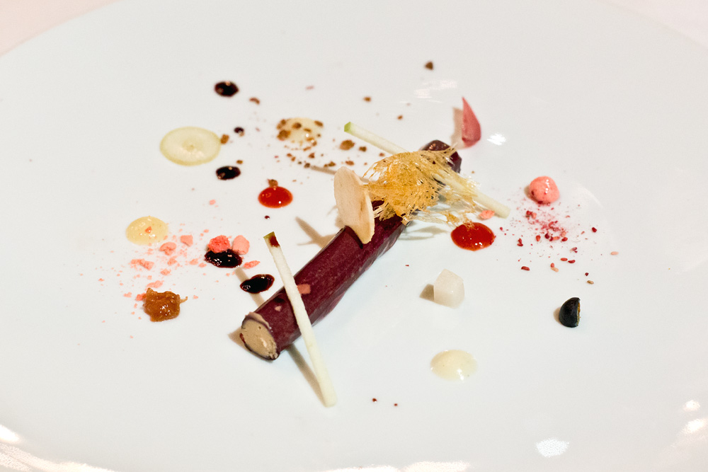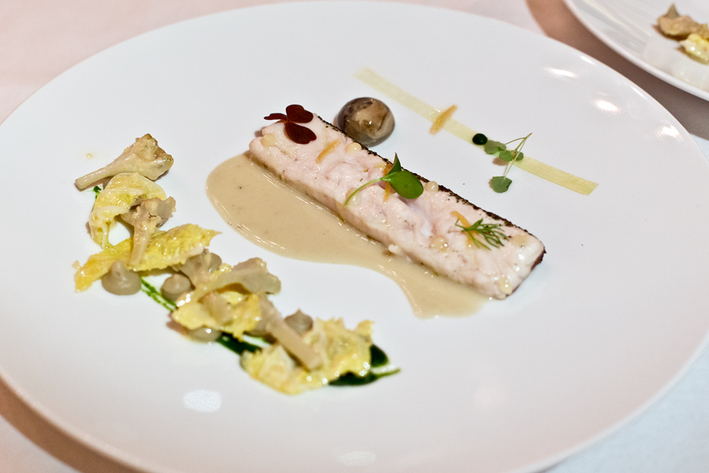 Der einen Tick zu trockene Wolfsbarsch hat eine schwarze Marinade vom getrockneten Seetang und ist ansonsten nicht gewürzt. Wir werden aufgefordert dem Fisch selber den letzten Kick zu geben, in dem wir die marmorierte Austernpraliné zerschneidet und sie mit dem Wolfsbarsch kombinieren. Bei uns will das irgendwie nicht funktionieren, wodurch das Ganze eher nach Auster statt nach dem edlen Fisch schmeckt. Schade. Dafür ist die Begleitung spitzenmässig. Sowohl die köstlichen Auberginen als auch der knackige Weisskohl und die Pilzmousse. Stark auch die wunderbare Zitronengras-Sauce.