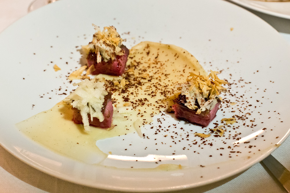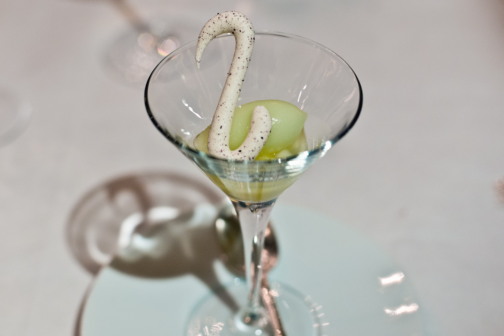 Auf einem, an ein Goldfischglas erinnerndes Gefäss, wird der zweite Gang serviert. Darin finden wir ein Eigelb welches eine Stunde lang bei 43 Grad erwärmt wurde. Umgeben ist es von einem fluffigen Kartoffelmousse mit caramelisierten und perfekt dosierten Zwiebeln sowie getrocknetem Speck. Etwas in den Hintergrund rückt der Herbsttrüffel. Hier hätten ein paar Scheiben Albatrüffel mehr herausgeholt. Trotzdem eine äusserst delikate Kombination mit einem süffigen Ergebnis.