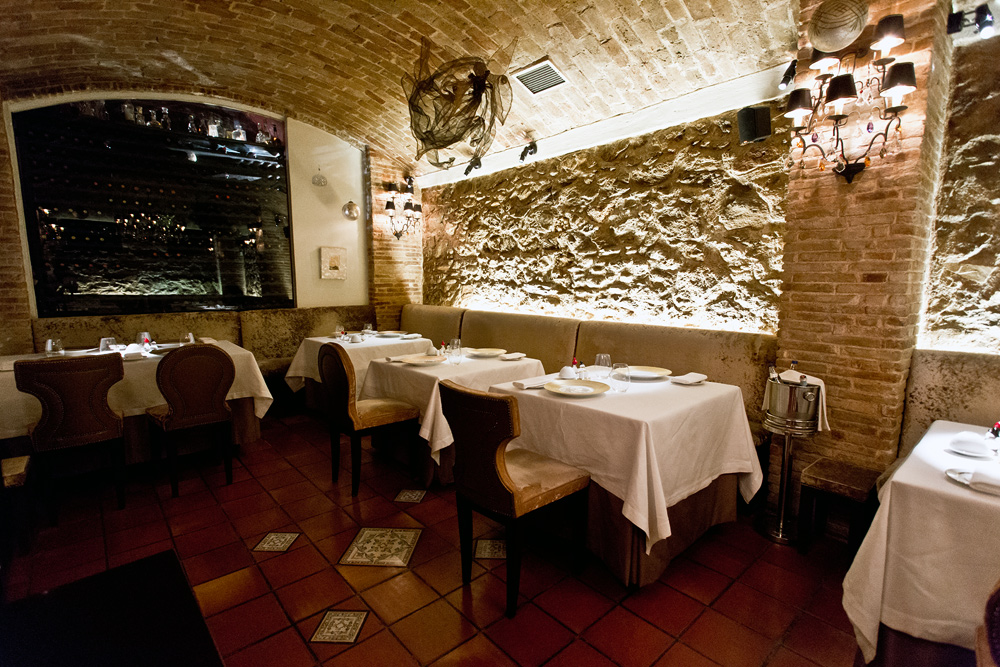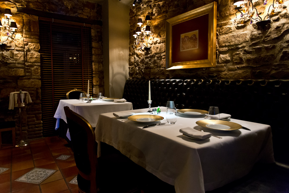 Vis à vis befindet sich eine grüne Holztür, durch die wir das zweifach besternte Lokal betreten. Gleich dahinter werden wir vom elegant gekleideten Gastgeber Christian Potelle begrüsst und die Treppe runter, in den eindrücklich schönen Speisesaal mit dem Namen „The Cellar“ geführt. Der zweite Speiseraum ist etwas kleiner und befindet sich im Erdgeschoss.