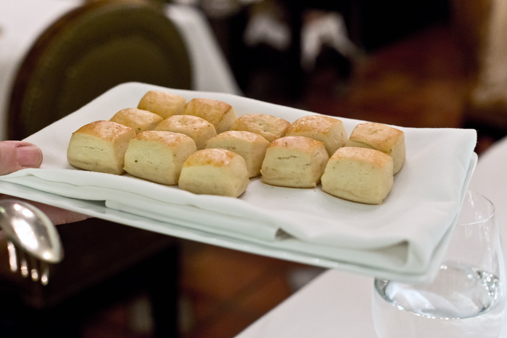 Die anschliessend präsentierte Brotauswahl ist zauberhaft. Nicht nur das noch warme Olivenbrot mit dem himmlischen Duft nach den schwarzen Perlen begeistert uns, sondern vor allem das hervorragende Knuspergebäck. Die Mischung aus Brioche und einem Gifpeli ist einfach himmlisch. Dazu serviert man uns Butter und Salz.