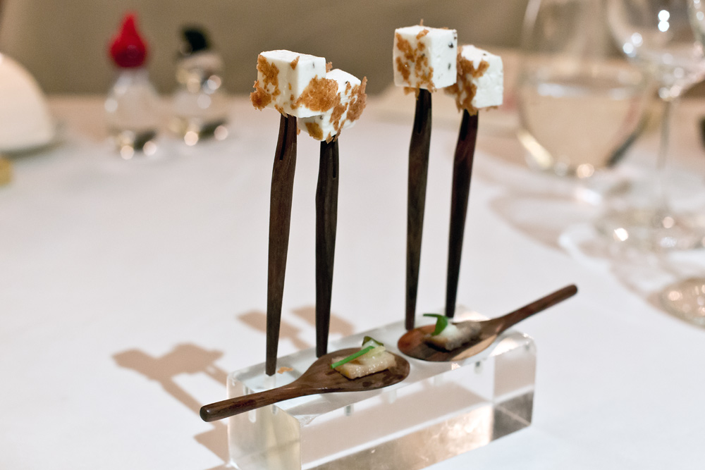 Der Aal auf dem kleinen Holzlöffel ist gut, der Feta-Quader besser. Uns gefällt die Kombination vom charaktervollen Schafskäse und dem pointierten Trüffel. Schade, dass dem Speck nur eine texturelle Rolle zusteht – der rauchige Geschmack wäre sicher eine Bereicherung gewesen.