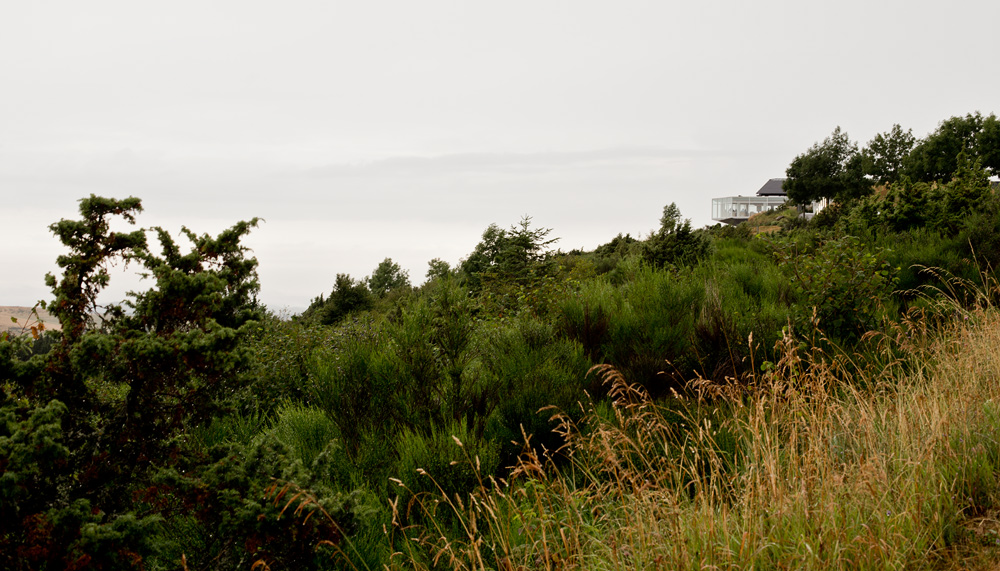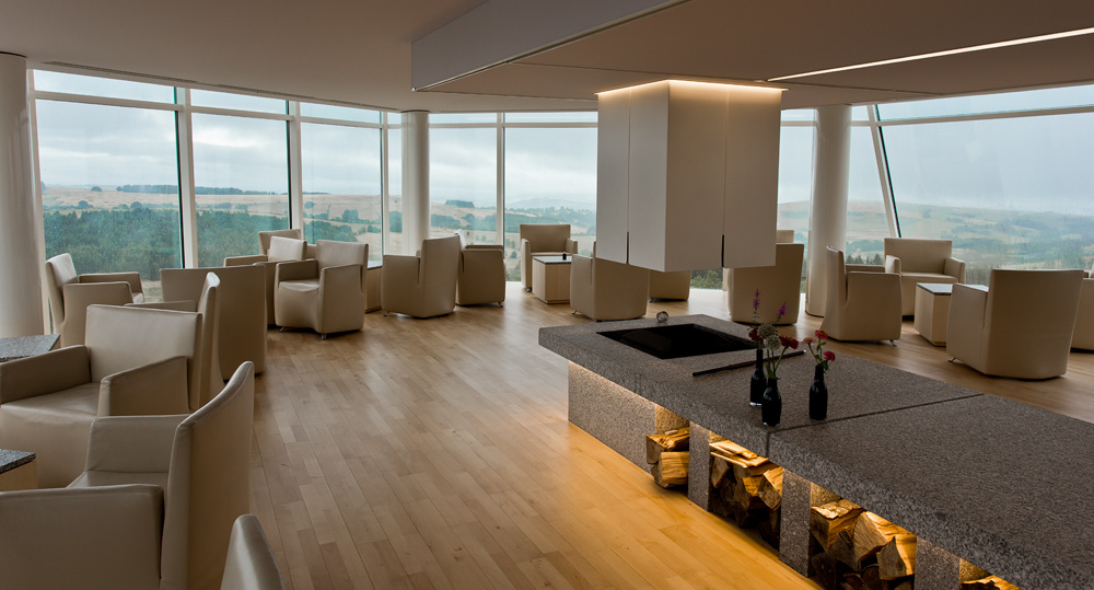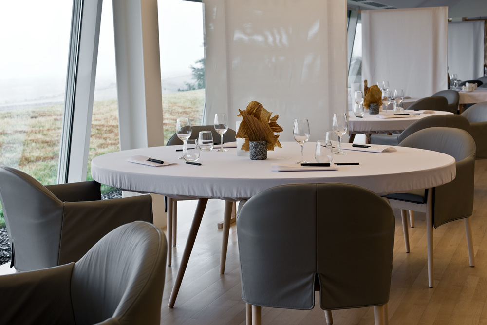 Im Restaurant angekommen werden wir von einer Dame hinter einer Empfangstheke begrüsst. Hier checken auch die Hotelgäste ein, die in einem der 11 Zimmer und Suiten nächtigen. Nach dem Prüfen unserer Reservation – das Restaurant ist heute ausgebucht – führt sie uns in die rundum verglaste Lounge. Der bekannte und futuristische Bau ist also nicht das eigentliche Restaurant, sondern derjenige Ort an dem der Abend beginnt und später auch wieder enden wird. Uns offenbart sich hier ein malerisches Panorama auf das just in diesen Sekunden die letzten Regentropfen fallen und die Sonnenstrahlen beginnen sich einen Weg durch die Wolkendecke zu bahnen.