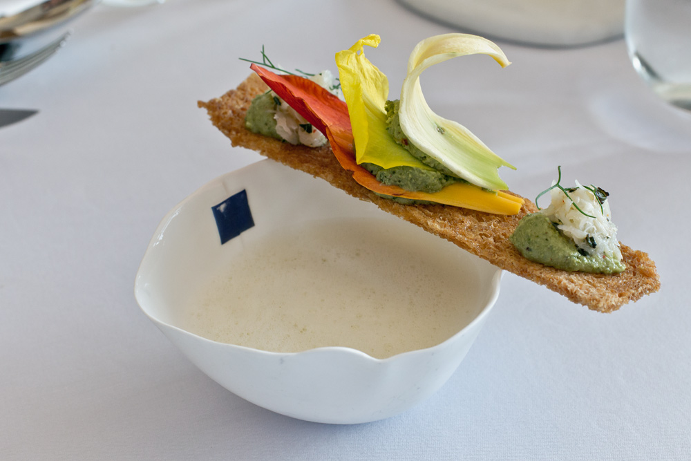 Ein Amuse Bouche scheint in französischen Restaurants keine Selbstverständlichkeit. In den meisten auf unserer Reise besuchten Sternerestaurants gab es keines. Hier setzt man glücklicherweise auf den „Gruss aus der Küche“ und bereits nach dem ersten Bissen sind wir unendlich dankbar dafür. Die Gemüsesuppe (am prominentesten schmeckt sie nach Spargeln) ist sommerlich kühl und absolut fantastisch im Geschmack. Darauf liegt ein knuspriges Buttergebäck mit einem intensiven Kräuter-Basilikum-Mousse, etwas fein geschnittener Kabeljau sowie würzige Blumenblätter. Ein optisch simples Gericht mit einem hervorragenden Geschmacksbild welches die Messlatte sehr hoch steckt.
