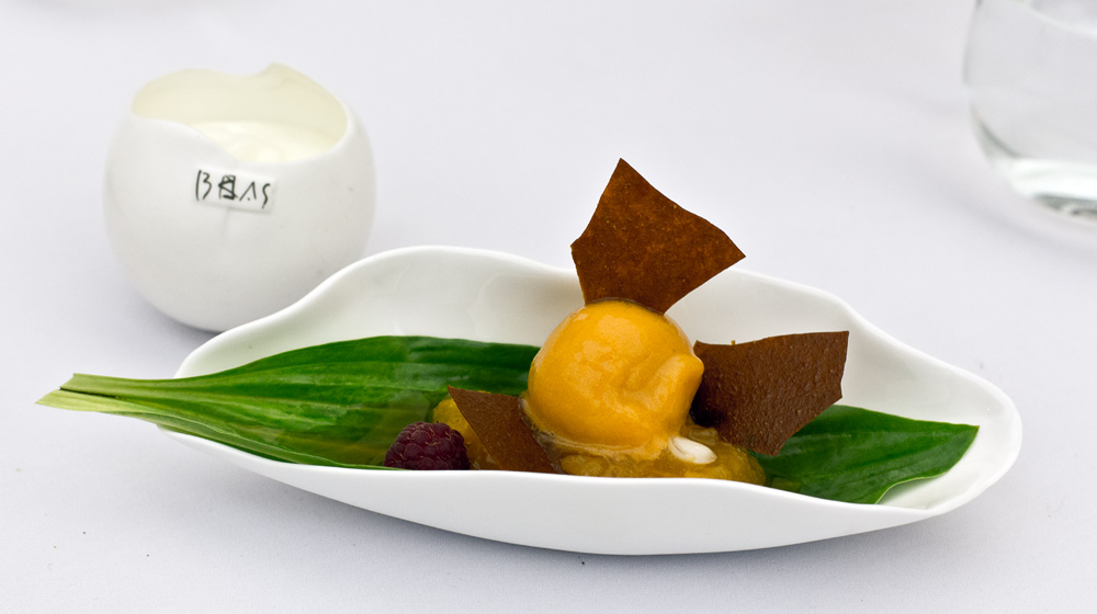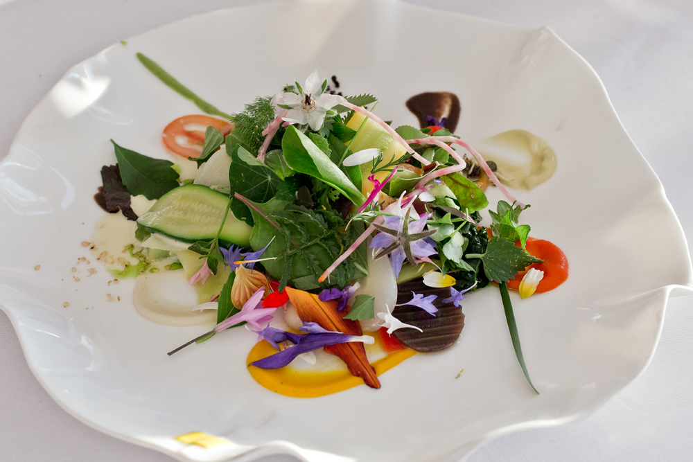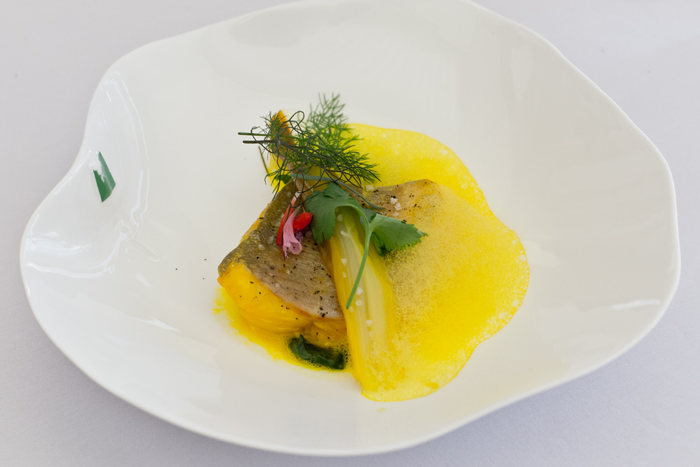 Danach folgt der Auftritt von Bras‘ Signature Dish: dem Gargouillou. Das berühmte Gericht ist ein fixer Bestandteil des Menüs und besteht je nach Saison zwischen 60 und 70 frische Zutaten. Am Tisch wird noch ein weisses Elixier darüber geträufelt. Danach tauchen wir die Gabel ehrfürchtig in das liebevoll arrangierte Durcheinander und staunen über die genialen Aromen im Mund. Gabel für Gabel geniessen wir mit geschlossenen Augen. Einfach himmlisch. Das Grossartige daran ist die Tatsache, dass man diesen Teller unzählige Male essen könnte und dabei nie das gleiche Ergebnis bekommt. Denn je nachdem welche Zutaten auf der Gabel landen schmeckt es mal bitter, mal ätherisch, mal rassig oder süss. Wahrlich ein Meisterwerk.