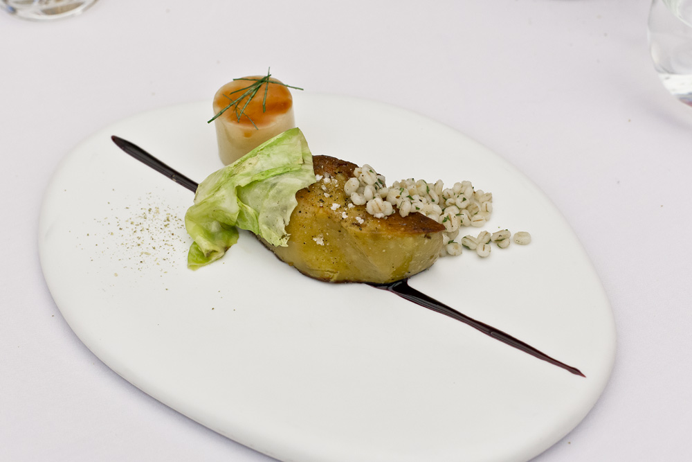Die Foie Gras treffen wir aktuell nur noch in etwa jedem fünften Gourmet-Menü an. Und dann hat sie ihren Auftritt meistens bei den Apéro-Häppchen als winziges Element. Entsprechend überrascht sind wir als man uns dieses stolz portionierte Exemplar auftischt. Einen solch kompromisslosen Auftritt erlebten wir zum letzten Mal vor vier Jahren in The Fat Duck in Bray. Die Assoziation entsteht nicht nur wegen der Grösse, sondern auch wegen dem Geschmack. Seit der Foie Gras bei Heston Blumenthal, sowie einer unvergesslichen Variation bei Andreas Caminada auf Schloss Schauenstein, haben wir nie wieder einen solchen Hochgenuss erlebt. Die Leber schmilzt förmlich auf der Zunge und hat einen traumhaft edlen Geschmack. Für den süssen Kontrast sorgt ein weisser Pfirsich mit vietnamesischem Koriander. Der delikate Heidelbeer-Essig sorgt für eine leichte Säure.