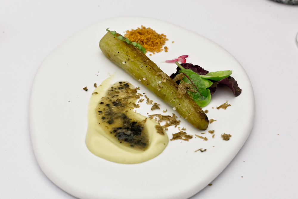 Dass bestimmt auch das vegetarische Menü eine hervorragende Wahl gewesen wäre beweist dieser Spargelsalat (Celtuce). Dieser wurde zuerst blanchiert und anschliessend gebraten. Er trumpft mit viel Eigengeschmack und schönen Röstaromen auf. Dazu gibt Bras noch ein paar Salzflocken und raffelt darüber schwarzen Trüffel aus Comprégnac.