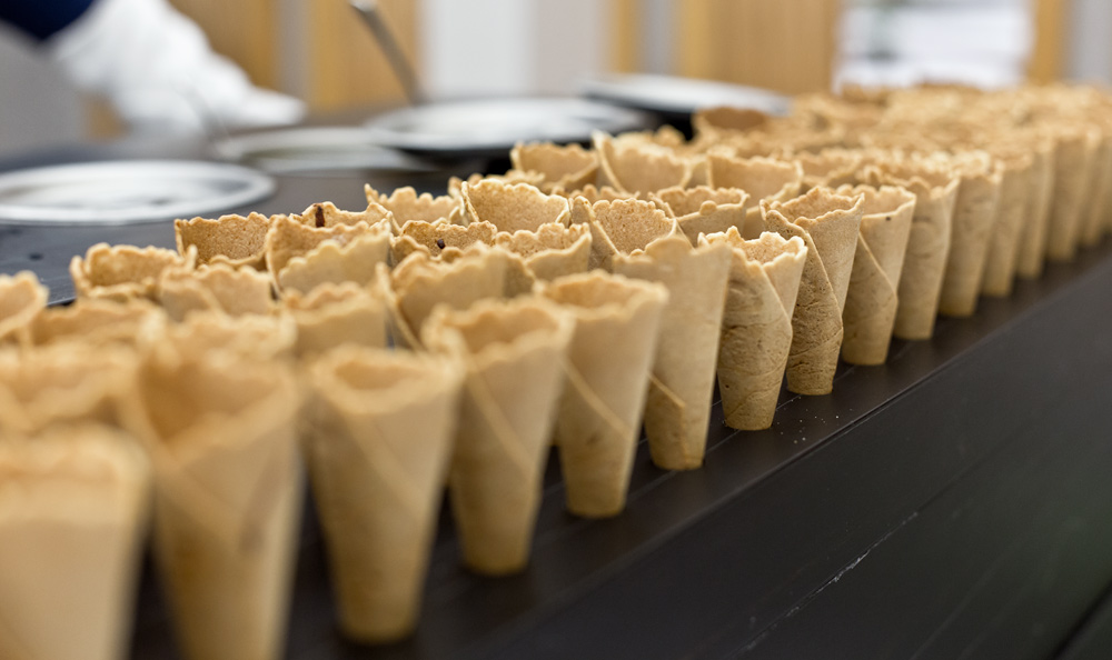 Zum grande Finale wird noch der Cornet-Wagen vorgefahren. Aus verschiedenen Geschmackskombinationen wählt jeder Gast sein Glace.
