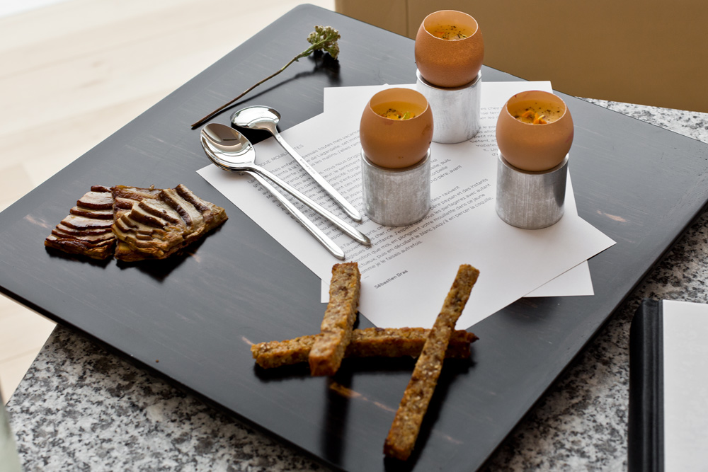 Nach und nach werden die Gäste um uns herum ins Restaurant begleitet. Irgendwann sind alle weg – auch das Servicepersonal. Wir warten noch ein paar Minuten und entscheiden dann, dass wir den Weg an den Tisch selber finden. Dies bleibt der Dame am Empfang nicht verborgen. Sie fängt uns ab und begleitet uns an den Tisch. Zuvor dürfen wir aber noch einen kurzen Blick in die Küche werfen. Hier ist die grosse Brigade mit voller Konzentration am Werk. Sébastian Bras steht am Pass und nickt uns freundlich zu. Wir betrachten die vollen Pfannen und die frischen Produkte und wollen dann möglichst rasch an den Tisch um all die Leckereien endlich essen zu dürfen. Unser Tisch steht ganz hinten im länglichen Restaurant und ist mit einem weissen Spannleintuch gedeckt. Von jedem Tisch hat man eine gute Sicht nach draussen – wobei die Aussicht hier nicht mehr ganz so schön ist wie noch vorhin in der Lounge. Uns gefällt das Restaurant, verlieben werden wir uns aber nicht. Dafür wirkt das Interieur zu erzwungen. Auch die Servicemitarbeiter, in ihren zu grossen dunkelblauen Uniformen, wirken eher wie Automechaniker. Aber zum Glück sind wir weder wegen dem Interieur noch wegen dem Schnitt der Mitarbeiterbegkleidung hierhergekommen.