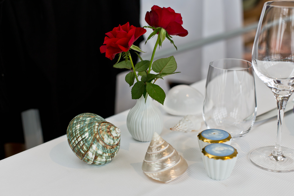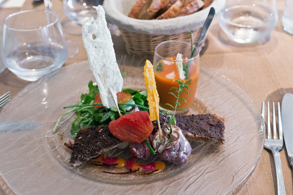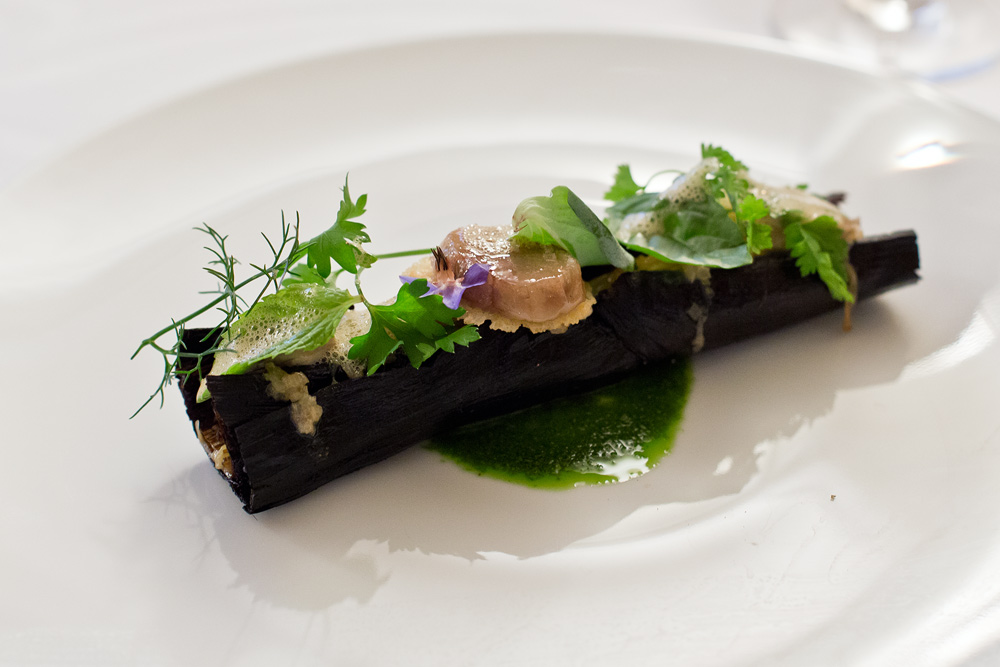 Wir bestellen das Menu Passion für 180 €. Das Restaurant ist voll und das sehr nette Serviceteam leider masslos überfordert. Die Gäste sitzen nicht nur vor gähnend leeren Weingläsern, sondern warten auch eine ganze Stunde auf das erste Gericht und nochmals 50 Minuten auf den zweiten Gang. Trotzdem hat sich der Besuch gelohnt. Zwar sind einige Gerichte etwas ausdruckslos, dafür gibt es auch zwei Highlights. Zum Beispiel die spannende und nicht alltägliche Kombination vom Hummer mit verschiedenen Fleischspezialitäten (vom Hackfleisch bis zum Würstchen). Gar auf 3-Sterne-Niveau ist der grossartige Lauch, der nach einem alten Rezept im Feuer gebraten und verkohlt wurde. Dadurch entfaltet sich im Innern ein grossartiges Aroma. Dazu kombiniert Olivier Bellin Austern und Knochenmark.