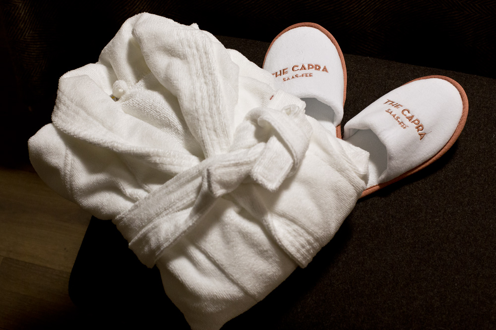 Wir besuchen das The Capra an einem sonnigen Wochenende im März. Saas Fee ist autofrei – was dem Dorf mit seinen vielen schönen Chalets, zusätzlichen Charme verleiht. Wir parkieren das Auto im grossen Parkhaus beim Dorfeingang und werden nach einem kurzen Telefonat mit der Réception vom hoteleigenen Elektroauto abgeholt. Weiche Lammfelle sorgen für eine bequeme Fahrt zum Hotel. Dort werden wir bereits von Raphael Herzog und seinem Front-Desk-Team erwartet. Das Gepäck verschwindet in der Suite und wir werden zum Welcome-Drink begleitet. Wir haben uns noch selten, schon nach wenigen Augenblicken so zu Hause gefühlt wie hier. Man spürt schon vom ersten Kontakt an, dass es im kleinen Haus sehr persönlich zu und her geht. Trotzdem wird die Diskretion stets gewahrt.