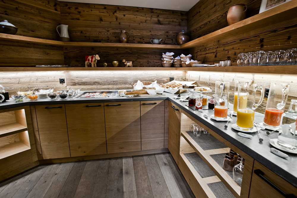 Bevor es am nächsten Morgen auf die Pisten geht, stärken wir uns beim Frühstück. Ob Früchte, frische Müesli, lokalen Käse und Fleisch – das kleine Buffet bietet für alle etwas. Selbstverständlich können auch Eier in allen Variationen bestellt werden.